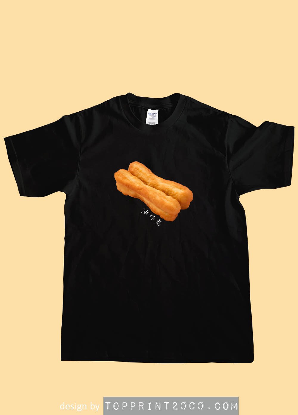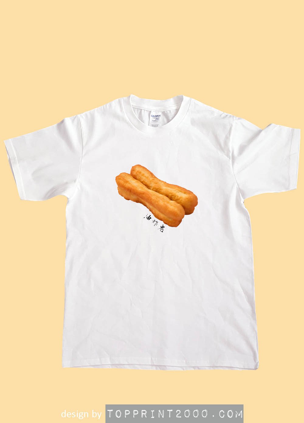 呢件 T shirt 嘅設計主角非常明確:正中央印上一對金黃色嘅油炸鬼。冇多餘背景,冇花巧修飾,亦冇任何誇張構圖,只係將兩條油炸鬼,以接近寫實嘅方式呈現出嚟。形狀完整、色澤自然,質感清楚,令人一眼就認得出佢係乜嘢。